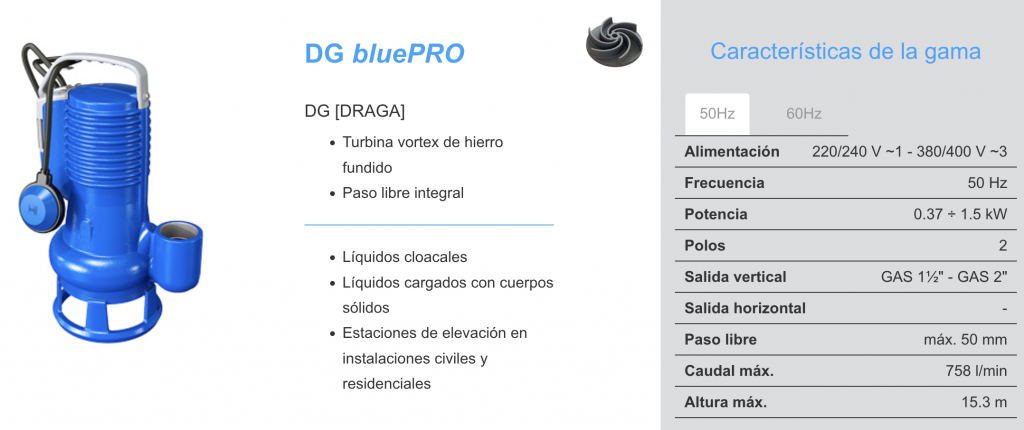 Los diferentes tipos de impulsor y la potencia eléctrica, determinarán las características de caudal y presión, así como el ámbito de aplicación del equipo. Como se observará en la curva característica, alcanza en alguna de las versiones los 22 m.c.a y hasta los 700 litros por minuto.
